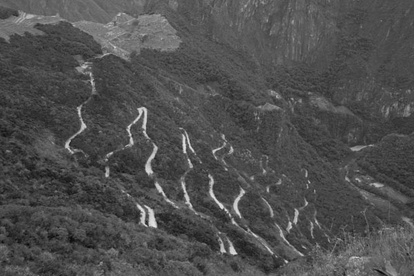 After the 1.5 hr train (assuming you’re not starting in Cusco, because if you are, add another 2 hours, which I would NOT recommend doing). The ride is an adventure in itself, passing ruins along the way. The train ends in a small town at base of the mountain, and then you take a 30 minute bus ride up a road with 12 switchbacks that feels much safer then it looks in the photo take from above.