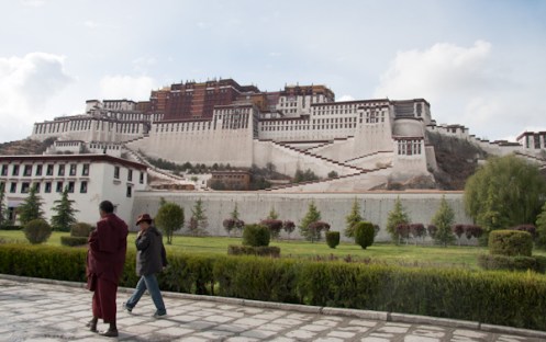 In Lhasa, the city police, military, security police, and several other uniformed, gun-toting officials makes for a very weird experience while walking around. It’s impossible, and I mean absolutely impossible to walk for more than a few minutes without seeing groups of uniformed officers. The military travel in groups of five, one carrying a rifle, one a fire extinguisher (presumably NOT to put out fires). Others travel in larger or smaller groups. There are armed guards in front of every official-looking building, of which there are many. And tonight I saw 20 police with full riot gear: shields, helmets, and batons. A riot in Lhasa?