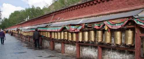 The wall behind the Potala Palace has over a thousand prayer wheels. This line of wheels goes on and on and on with a constant stream of people praying and spinning.
