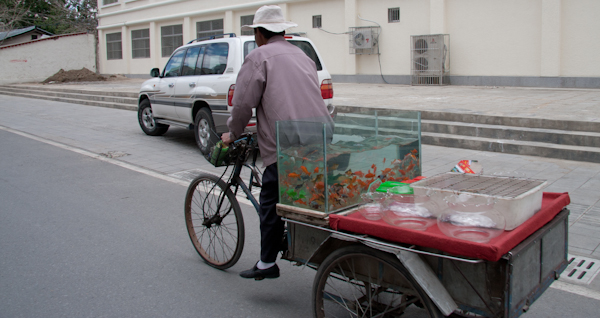 Look closely, not a great photo, but I had to shoot fast. Lhasa is filled with people riding bicycle carts selling or carrying every imaginable item. But selling goldfish? Now that’s original.