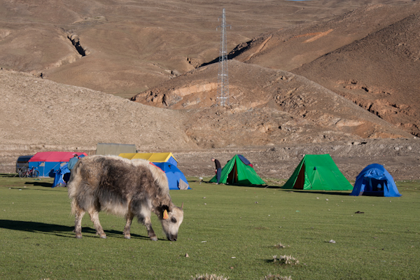 Our camp today was at the base of the day’s big climb, to get us over a pass and onto the Tibetan Plateau. The climb was 17 miles and 4700 feet of climbing with a maximum altitude of 15,900 feet. The total day was 50 miles, all the rest being mostly flat after the climb. The Tibetan Plateau in the area of our riding is consistently around 14-15,000 feet, so that will be our base altitude for the next 10 days, with climbs taking us to 16 to 17,000 feet.