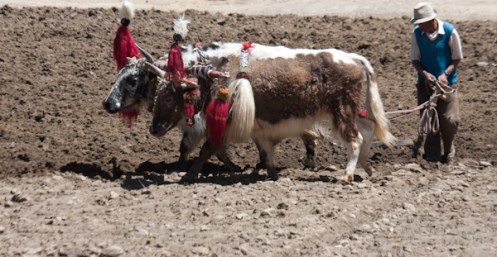 This farmer was plowing his field, singing the whole time, and apparently thoroughly enjoying his work. Can you imagine dressing up your farm animals any more than this? It’s not as though these are animals in some tourist district posing for photographs. They are working! Further down the road I saw some Yak with Tibetan Prayer scarfs around their necks. Very chic!