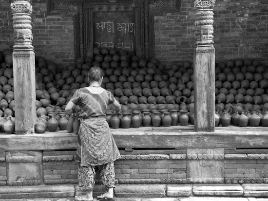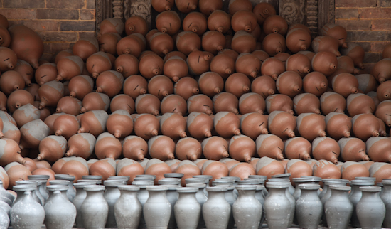 Pots in Kathmandu in the pottery district of Bhaktapur. Saw lots of clay, saw unfired and fired pots, saw an huge earthen kiln, but couldn’t find anyone actually throwing a pot.
