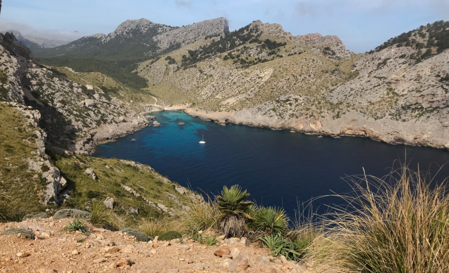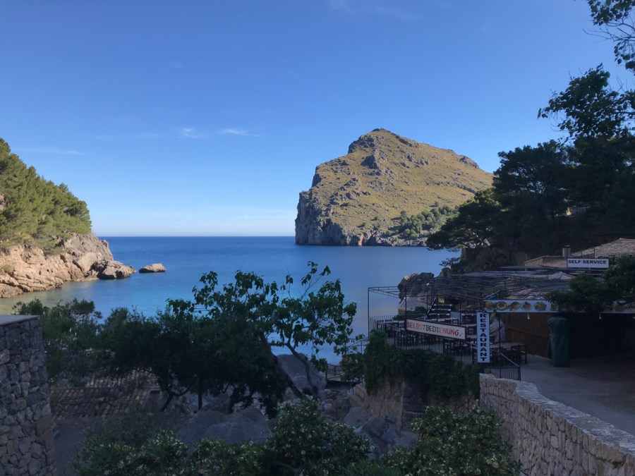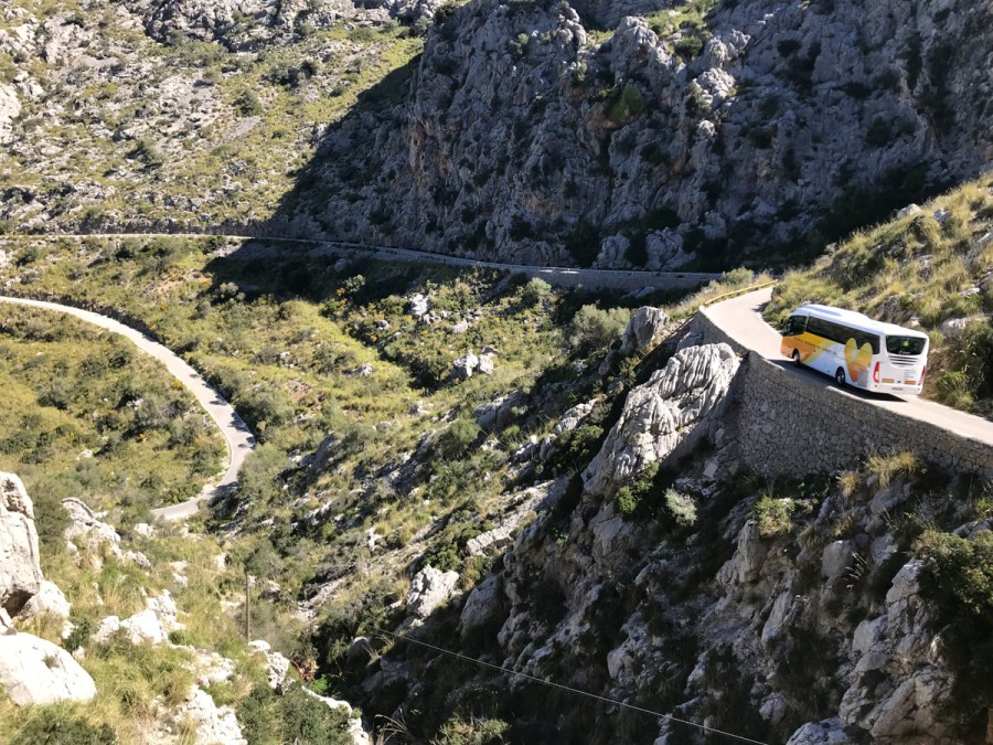 I left Selva pretty early for the climb up to the summit then to drop down to Sa Calobra, and on that initial climb I was alone, and it was wonderful. I was also alone on my descent into Sa Calobra so I could fly down the hill. At the bottom, zero tourists, no cyclists as it was still pretty early. However, on my ascent, as I got past the halfway mark, a phalanx of busses, cars, and a growing wave of cyclists were coming down. As the busses can’t make the turns around the switchbacks very effectively, it requires full attention to keep from getting squashed against the guardrail. Not exactly a peaceful ascent, though, as I was still pretty early, there were sections of serenity that I relished.